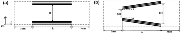 狹縫孔由半有限狹縫孔由兩個平行的石墨壁組成。每個壁包含三個石墨烯層,如圖1(a)所示。框的虛線表示模擬框在y和z方向上的邊界。周期性邊界條件僅適用于x方向。兩個開口端與大塊氣藏相連,每個氣藏沿y軸的長度為3nm,孔隙寬度決定了z方向的尺寸。因此,通過孔內分子與體相的相互作用,可以在孔和周圍環境之間保持機械平衡。孔徑H是指通過一個壁最內層中碳原子中心的平面與相對壁的相應平面之間的距離。楔形孔在圖1(b)描繪了一個開放的楔形孔及其結構參數:小端(SH)和大端(BH)的孔徑,軸向孔長(L)和半角(α)。框的虛線表示模擬框在y和z方向上的邊界。與狹縫孔一樣,開口端周圍的氣體沿y軸的長度為3nm,大端的寬度決定了z方向的尺寸。沿軸向(即,y方向)的孔長度是有限的L,而在x方向上的尺寸在應用周期性邊界條件的情況下假定為無限。