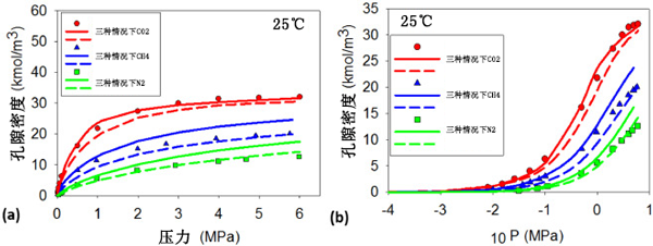 圖2:純氣體N2、CH4和CO2在T=25℃時在活性炭上的實驗數據。用狹縫和楔形孔中的吸附等溫線預測數據:(a)絕對壓力和(b)對數標度的絕對壓力。