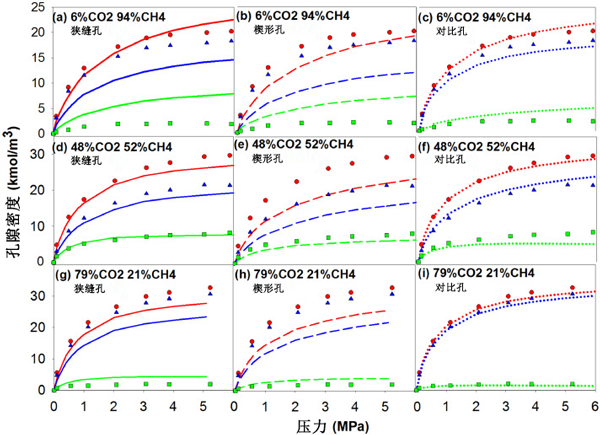 圖3:混合氣體在T=25℃在狹縫孔、楔形孔中的吸附等溫線 和理想吸附在93kPa至6.077MPa的壓力范圍內的預測值,以及從它們的混合物中吸附的CO2和CH4。