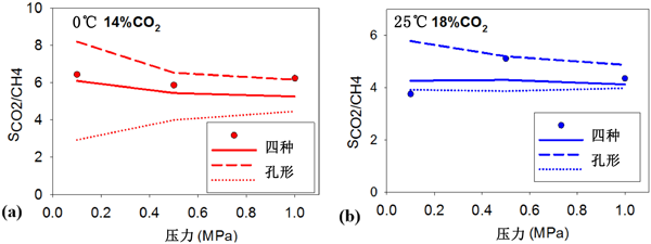圖4:在T =(a)0℃和(b)25℃時,在大約20%的二氧化碳在活性炭孔隙呢,CO2對CH4的選擇性與實驗數據。