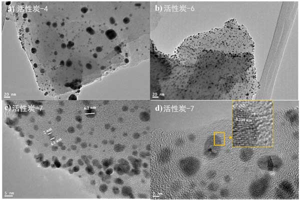 為了進(jìn)一步研究金顆粒在活性炭表面的分布和結(jié)晶度,我們拍攝了鍍金活性炭樣品的透射電子顯微鏡圖像。圖7顯示了各種活性炭樣品在不同放大倍數(shù)下的TEM圖像。圖2a、b顯示了金納米粒子在活性炭表面上的分布。很明顯,兩個(gè)樣本的分布是均勻的。活性炭-4和活性炭-6似乎都以類似的方式相互作用和承載金納米粒子;钚蕴-7樣品的高分辨率TEM圖像如圖2c、d所示。圖2c顯示大多數(shù)金納米顆粒很小,直徑為3-5nm,并且只能看到少數(shù)團(tuán)聚顆粒。圖2d顯示了金的晶格條紋間距。發(fā)現(xiàn)晶格條紋間距為0.217nm,對(duì)應(yīng)于金晶面的面。此外,我們?cè)噲D通過(guò)TEM圖像估計(jì)顆粒尺寸的分布,我們發(fā)現(xiàn)所有樣品中超過(guò)80%的金顆粒的尺寸小于5nm。