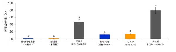 圖3:經生物處理的含殺菌劑流出物(未稀釋或稀釋50%)在通過砂濾器和活性炭吸附柱系統處理前后的發(fā)芽指數(GI)值。由相同字母指定的條形在5%的水平上沒有統計差異。