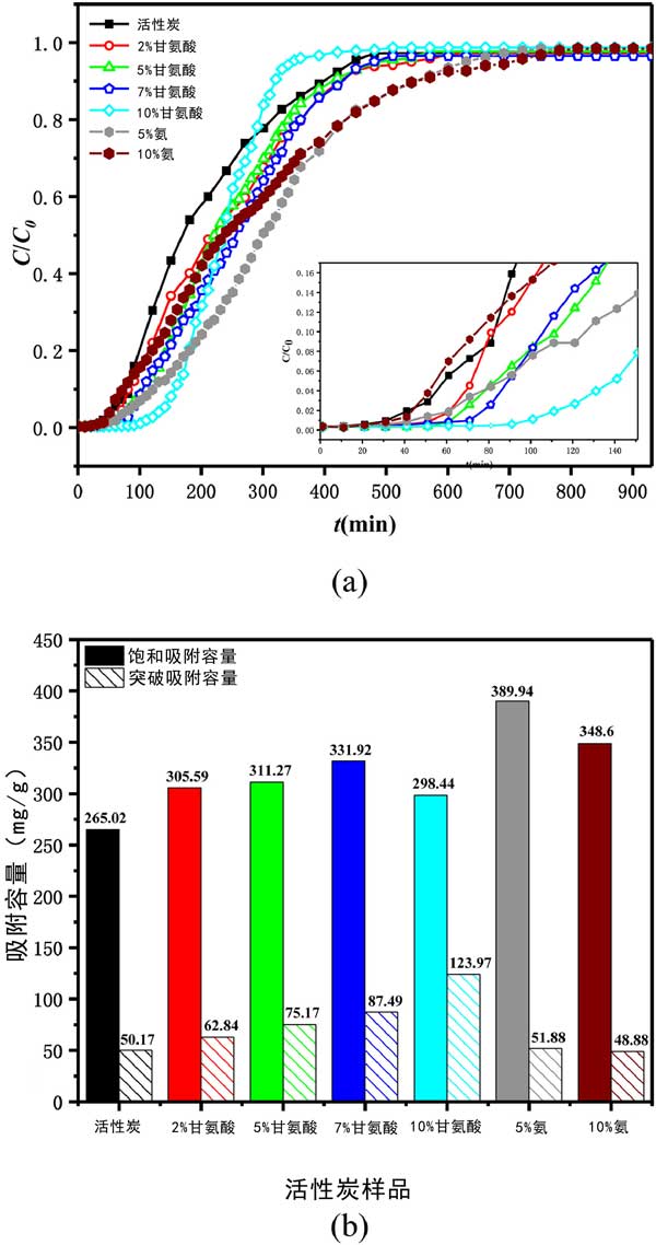 測試了選定的甲苯VOC對活性炭的吸附性能。在每個實驗運行中,甲苯通過裝有活性炭的吸附管直到達到平衡,即活性炭吸附劑被甲苯飽和。圖2(a)所示的穿透曲線呈現(xiàn)為甲苯吸附量吸附(ç/ç0)與接觸時間(噸,分鐘)六種的活性炭正在進行中,它們的飽和和突破吸附容量如圖2所示(b)。從吸附曲線可以看出,甘氨酸修飾的活性炭的穿透時間明顯延長,而飽和氨改性活性炭的時間延長;钚蕴可霞妆酱┩肝侥芰Φ捻樞驗10%甘氨酸改性活性炭>7%>5%>2%>5%氨改性活性炭>未改性活性炭>10%氨改性活性炭,而活性炭對甲苯飽和吸附容量的順序如下:5%氨改性>10%>7%甘氨酸改性>5%>2%>10%>未改性活性炭。可見甘氨酸修飾對甲苯吸附有顯著的正向影響。與原來的AC相比,甘氨酸改性的活性炭對甲苯的突破吸附能力分別提高了25%、50%、74%和147%,隨著甘氨酸濃度的增加呈上升趨勢。同時,甘氨酸改性的活性炭對甲苯的飽和吸附容量分別增加了15%、17%、25%和13%,且隨著甘氨酸濃度的增加先增加后減少。5%和10%的氨改性也提高了甲苯的吸附性能,但其優(yōu)勢主要體現(xiàn)在飽和吸附容量上,與原來的活性炭相比,分別提高了47%和32%。