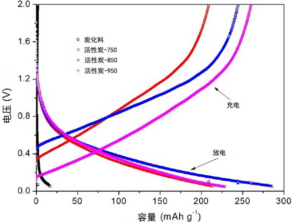 充放電曲線評估了活性炭的的電化學(xué)性能,不同溫度活化的活性炭電極如圖3所示。CD測試是在0.25C的電流密度速率下進(jìn)行的;罨瘻囟忍岣吡顺潆娙萘;钚蕴繕悠返母叱潆娙萘繛260.36mAh/g-1,而炭化料樣品的低充電容量為1.98mAh/g-1。這是因?yàn)榛罨臉悠房梢晕蘸芏嗟匿囯x子。放電曲線顯示三個(gè)不同的電位區(qū)域,這可能歸因于不同的機(jī)制。0到0.12V的區(qū)域?qū)?yīng)于鋰離子從隨機(jī)取向的小分子堆疊中的微孔中脫出。0.12到0.8V的區(qū)域歸因于鋰離子從無序石墨烯層中脫出。高于0.8V的區(qū)域?qū)?yīng)于鋰從各種邊緣位置或石墨烯層中含H-/O官能團(tuán)的脫嵌。