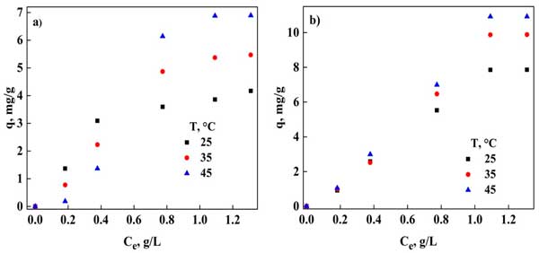 平衡吸附分析使我們能夠獲得不同等溫線模型的參數(shù),表明在去除污染物時(shí)進(jìn)行了何種類型的過(guò)程。在圖1中,顯示了使用粉末活性炭(圖1a)和活性炭(圖1b)在不同溫度下DNS的吸附能力。還觀察到3,5-二硝基水楊酸在兩種吸附劑中的吸附都隨著溫度的升高而顯著影響,隨著溫度的升高呈現(xiàn)出更大的吸附。因此,在45℃時(shí),活性炭和粉末活性炭的大吸附容量分別為6.97和11.57mg/g。這可能是由于去除過(guò)程的環(huán)境,這會(huì)導(dǎo)致吸附劑表面隨著溫度的升高而增加其對(duì)3,5-二硝基水楊酸吸附的參與。使用商用活性炭的文獻(xiàn)中也報(bào)道了類似的行為。在其他研究中,使用這種吸附劑還觀察到,基于苯酚、高氯酸鹽和重金屬等的不同化合物的吸附能力有所增加。