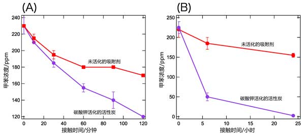 為了研究在此處使用的條件下K2CO3活化的活性炭是否可以完全去除甲苯,觀察甲苯濃度24小時。圖3b顯示了24小時觀察期間甲苯濃度與時間的關(guān)系。活性炭顯然能夠從空氣中吸附大量氣態(tài)甲苯。吸附24小時后的最終甲苯濃度非常低,僅檢測到痕量的甲苯。相比之下,當使用未活化的吸附劑時,即使在吸附24小時后,仍有相當數(shù)量的甲苯(160ppm)。