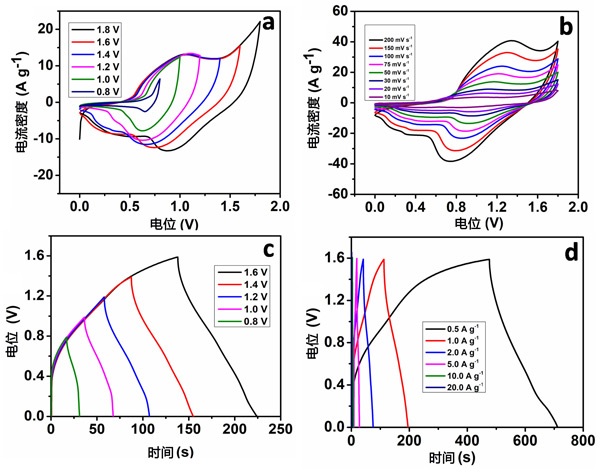 超級(jí)電容器裝置的制造是集成陰極(氧化鎳),陽極(活性炭)使用纖維素濾紙(在2.0M/KOH電解液中浸泡放置)分離,然后用絕緣膠帶包裹。陽極和陰極具有相似的幾何表面積,再經(jīng)過合適的重量比來制成電容器。圖2a顯示了超級(jí)電容器件在各種截止區(qū)域中的CV曲線,掃描速率為50mVs-1。從圖中可以看出,電容器件的CV曲線呈現(xiàn)出典型的準(zhǔn)矩形電容性能,這對(duì)應(yīng)于雙電層電容器和贗電容的相互貢獻(xiàn)。此外,當(dāng)增加工作截止區(qū)時(shí),會(huì)發(fā)生更多的法拉第電化學(xué)反應(yīng)。當(dāng)工作電位超過1.7V時(shí),也會(huì)在CV曲線上注意到氧氣的釋放;钚蕴/氧化鎳器件很大程度上取決于截止區(qū)域。因此,選擇1.6V作為隨后研究超級(jí)電容器件電化學(xué)性能的潛在窗口區(qū)域。圖2b顯示了活性炭電容器件在0到1.6V的截止區(qū)域內(nèi)的各種掃描速率下的CV曲線。電流密度隨著掃描速率的增加而增加,并且氧化峰電位轉(zhuǎn)移到更正的電位,類似三電極器件的結(jié)果。
