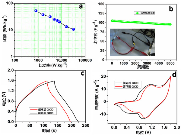 Ragone圖在圖3a顯示;钚蕴侩娙萜髟诠β拭芏葹52.4和10.6Wh/kg-1時(shí)顯示出高能量密度分別為800和32,000W/kg-1。接著,研究了活性炭新型儲(chǔ)能器件在1Ag-1下的循環(huán)性能,在0到1.6V的電位窗口范圍內(nèi)進(jìn)行了超過5000次循環(huán),如圖3b所示。電容器的比電容在1Ag-1的5000個(gè)恒電流充放電循環(huán)期間仍保持95.6Fg-1,約為初始電容的90.6%。該器件的恒電流充放電曲線在5000次循環(huán)后仍保持相同的對(duì)稱曲線,表明該器件仍具有良好的可逆電化學(xué)活性。由于活性炭電容器件在循環(huán)過程中歐姆電阻的增加,比電容正在衰減。由于在充放電過程中活性材料體積的變化,活性材料和基板之間的界面接觸可能會(huì)隨著時(shí)間的推移而惡化,從而導(dǎo)致器件的歐姆電阻更高。此外,在循環(huán)過程中,活性炭材料可能會(huì)從基板上脫落,從而導(dǎo)致電容被低估。因此,必須優(yōu)化電極構(gòu)建方法以提高器件的可循環(huán)性。圖3b從而導(dǎo)致這種活性炭電容器件在下一代儲(chǔ)能應(yīng)用中的巨大潛力。圖3c、d分別顯示了電容器器件的穩(wěn)定性研究(5000次循環(huán)后)之前和之后的恒電流充放電曲線和CV曲線。由活性炭制成的新型儲(chǔ)能產(chǎn)品的比電容在5000次恒電流充放電循環(huán)后仍保持初始電容的約90%。
