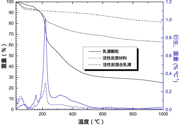 由于這種粘合劑對(duì)于這一特定應(yīng)用的新穎性,有必要首先研究原料顆粒的碳化。圖2顯示了在非氧化氣氛下活性炭前體和僅有粘合劑的生粒料在非氧化氣氛下的熱行為。椰殼炭在所研究的溫度范圍內(nèi)非常穩(wěn)定,在1000℃時(shí)僅減輕17.7%的重量,其中幾乎一半(8%)對(duì)應(yīng)于水分的釋放;钚蕴壳绑w的這種低揮發(fā)性排放形成對(duì)比。在相同溫度下觀察到乳清重量損失70%。這意味著焦炭產(chǎn)量約為。30%的乳清粘合劑在1000℃。乳清顆粒的大部分揮發(fā)性排放發(fā)生在低于600℃的溫度下,在175至275℃之間觀察到大量重量損失。在類似條件下獲得的純α-乳糖或乳清蛋白的熱曲線中不存在這種熱事件。據(jù)推測(cè),這種特殊的熱行為可能是美拉德聚合物或樹脂的特征。這種新粘合劑的其他次要事件歸因于結(jié)晶α-乳糖的脫水等。