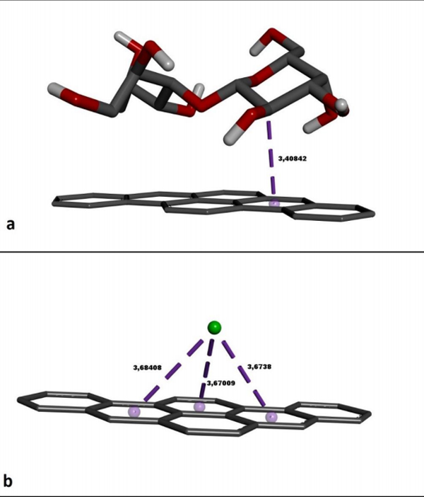 在這項研究中,進(jìn)行了分子對接以檢查活性炭與乳糖以及離子:鈣的原子間相互作用。如圖2a所示,乳糖分子在其結(jié)構(gòu)中的吡喃半乳糖環(huán)的第三個碳原子上與活性碳的六角碳環(huán)形成一個疏水π-σ接觸。雖然這種非鍵合接觸的長度為3.40Å,但乳糖與活性炭的結(jié)合自由能是有利的。鈣(Ca+2)離子與三個相鄰的活性炭六角碳環(huán)形成三個鍵相互作用(圖2b)。