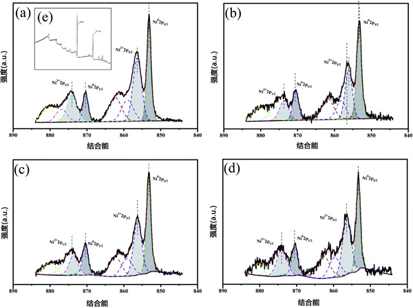 圖1:Ni2p在(a-d)多種活性炭催化劑上的XPS圖,(e)載鎳活性炭催化劑。