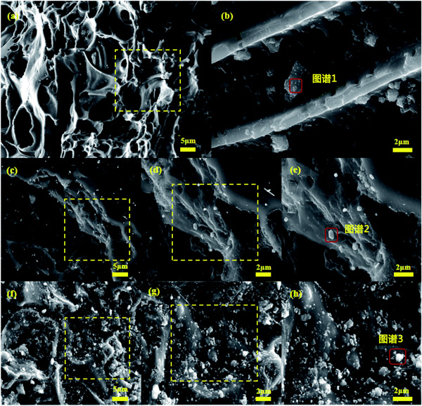 活性炭和鋅鹽失活催化劑的SEM圖像在圖2顯示。從圖2a和b可以看出,載銅活性炭催化劑具有良好的孔結(jié)構(gòu),不同尺寸的金屬氧化物顆粒分布在催化劑表面。放大5000倍后(圖2b),有利于反應(yīng)氣體吸附的孔結(jié)構(gòu)仍清晰可見。圖2c-e顯示ZnCl2-活性炭催化劑的大部分表壁坍塌,孔結(jié)構(gòu)嚴重受損,表明ZnCl2摻雜后活性炭結(jié)構(gòu)強度降低。圖2f-h表明ZnSO4-活性炭催化劑基體受到一定程度的破壞,表面粗糙,孔隙結(jié)構(gòu)幾乎看不到,僅在某些位置附著較大的金屬氧化物顆粒,局部堆積。這種團聚現(xiàn)象發(fā)生在ZnSO4摻雜后的催化劑表面,不利于CO和NO氣體的吸附,導(dǎo)致脫硝活性下降。