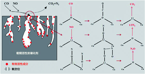 在活性炭催化劑表面通過選擇性催化還原技術(shù)(CO-SCR)反應(yīng)進行的低溫脫硝是一種具有代表性的非均相催化體系,遵循Langmuir-Hinshelwood反應(yīng)機理。因此,提出了圖3所示的脫硝機制,用于在活性炭催化劑上對NO進行CO還原。活性組分Cu均勻分散在活性炭上,增加了催化劑的比表面積和對NO和CO的吸附。這一結(jié)論表明Cu均勻分布在活性炭催化劑的表面,將脫硝效率提高到80%。CO吸附在催化劑表面以還原-O-Cu2+到=Cu+并生成CO2。吸附的NO解離成N和O,解離的N原子與NO分子結(jié)合形成N2O。據(jù)報道,NO的解離是CO誘導(dǎo)的NO消除的關(guān)鍵步驟。活性位點的釋放促進了CO的吸附,最后N2O和=Cu+反應(yīng)生成N2和–O–Cu2+,這進一步促進了脫硝反應(yīng)。在CO與NO的反應(yīng)中,Cu2+↔Cu+交換可能會改變催化劑表面的價態(tài),更多的氧空位可用于轉(zhuǎn)化過程,促進NO向N2的轉(zhuǎn)化。