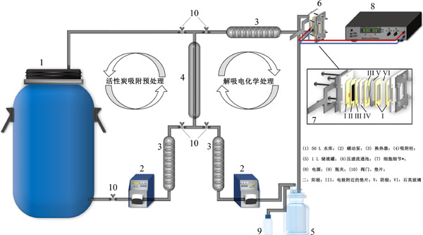 制備含有300mg/L-1苯的甲醇溶液和含有50mmol/L-1電解質(zhì)(H2SO4)的水介質(zhì),以確定污染物的去除效率。初始pH值約為1.5,在電化學(xué)過程測試期間未觀察到顯著變化。使用包含電極作為陽極和鈦板作為陰極的單隔室壓濾流動池(在圖1中詳細(xì)表示)進(jìn)行電解,其具有13.5cm2的明顯幾何面積。兩個電極由墊片隔開,距離為4毫米。使用含有1L溶液的夾套玻璃容器,蠕動泵以1L/min-1的速度將溶液泵入熱交換器,然后循環(huán)通過電池。使用恒溫浴將溫度控制在25℃。在恒電流模式下以50mA/cm-2的電流密度進(jìn)行電解。使用前,將陽極在H 2 SO4/0.05mol/L-1溶液中以40mA/cm-2極化20分鐘, 以從其表面去除任何雜質(zhì)。電化學(xué)實驗一式三份進(jìn)行。