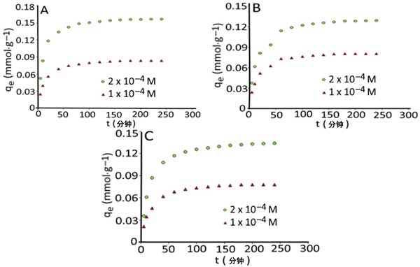 圖1:接觸時(shí)間和初始濃度對(duì)25℃時(shí)乙基橙(A)、甲基橙(B)和間苯胺黃(C)在活性炭上吸附的影響。