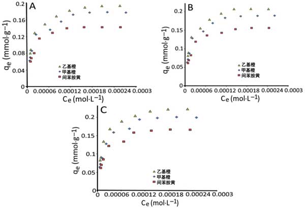 圖2:25℃(A)、35℃(B)和45℃(C)下偶氮染料在活性炭上的吸附等溫線。