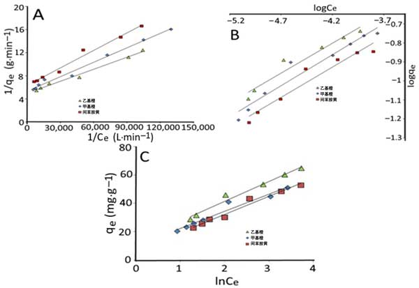 圖3:Langmuir(A)、Freundlich(B)和Temkin(C)在25℃下偶氮染料在活性炭上上的吸附等溫線。
