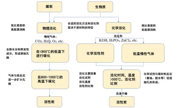 活化過程是活性炭制備的核心階段,是前驅體孔隙結構的進一步擴大;罨^程包括三個主要階段:焦油物質的消除、基本碳晶體的燃燒和碳顆粒的氧化。主要因素有活化類型、活化劑、活化溫度、浸漬比、活化時間、氣體分壓等。活化方法可分為物理活化、化學活化、物化偶聯活化法、微波活化、模板法等,最常用的方法是物理活化和化學活化。物理活化和化學活化衍生的活性炭制備見圖2。