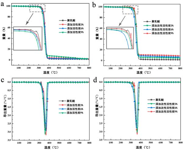 熱重分析結(jié)果列于圖3中。所有樣品均呈現(xiàn)單一熱降解階段,但5%質(zhì)量損失溫度(T5%)或熱降解速率最高溫度(Tmax)略有不同。純聚乳酸在322℃時(shí)開(kāi)始快速降解,如圖3a所示,其Tmax達(dá)到363℃,并且在400℃時(shí)幾乎所有質(zhì)量都損失了。在800℃的終端溫度下測(cè)得相應(yīng)的殘?zhí)柯蕛H為1.35%。相比之下,當(dāng)應(yīng)用改性活性炭時(shí),酸性添加劑(磷酸鹽)會(huì)促進(jìn)聚乳酸復(fù)合材料的較早分解,這與之前的結(jié)果一致。殘?zhí)柯孰S著復(fù)合材料中改性活性炭的加載而逐漸增加。純聚乳酸和改性活性炭復(fù)合材料的Tmax幾乎沒(méi)有差異,分別為363℃、364℃、357℃和363℃。因此可以看出,改性活性炭負(fù)載對(duì)聚乳酸降解沒(méi)有影響。在600℃到800℃的范圍內(nèi),聚乳酸燃燒的殘余物沒(méi)有質(zhì)量變化,但在一定程度上可以觀察到輕微的質(zhì)量損失,表明加入改性活性炭后復(fù)合材料的燃燒延遲。