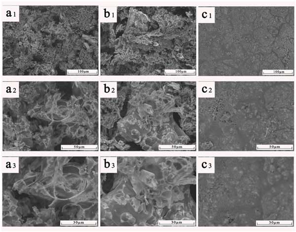 當(dāng)加載足夠的改性活性炭時(shí),膨脹的殘余碳可以通過(guò)其質(zhì)量、連續(xù)性和致密性得到證實(shí),這些都得到了極大的改善。一般來(lái)說(shuō),膨脹的殘余碳可以減少凝相和氣相之間潛在的熱和傳質(zhì),這反過(guò)來(lái)又會(huì)引起燃燒抑制。經(jīng)過(guò)錐形量熱儀測(cè)試后如圖4中的圖案所示,可以注意到殘留碳的顯著形態(tài)差異。在改性活性炭6%和改性活性炭9%的表面上可以看到空隙和裂口(圖4a1、b1),它們可以作為熱量的擴(kuò)散途徑,并且在燃燒過(guò)程中會(huì)揮發(fā)。此外,相比之下,改性活性炭9%在表面提供了精細(xì)的皺紋覆蓋層(圖4c1),這產(chǎn)生了有效的凝聚相阻燃性,此外,皺紋形態(tài)可以作為復(fù)合材料的增強(qiáng)框架。