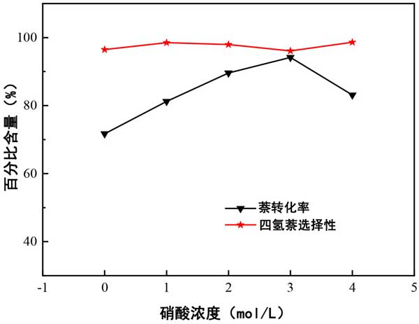 圖2:改性劑濃度對萘轉(zhuǎn)化率和四氫化萘選擇性的影響。