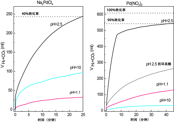 兩種不同的Pd前驅(qū)體在不同浸漬pH下制備的活性炭催化劑在60℃時產(chǎn)生的重整氣體(H2+CO2)的體積隨時間的變化曲線圖在圖2顯示。由于甲酸鈉添加劑對甲酸脫氫的促進作用,催化測試在存在的情況下進行]。所有制備的樣品都顯示出研究反應的活性。正如在當前測試條件下所預期的,曲線的形狀遵循甲酸中的一級動力學。為了更好地理解析氫曲線,我們測量了不同階段的反應pH值:分散催化劑和甲酸鈉在60℃攪拌30分鐘后,注入甲酸后,當反應開始時和使用Na2PdCl4制備的催化劑系列反應25分鐘后和Pd(NO3)2系列反應40分鐘后,根據(jù)圖7所示的曲線。表明在所有樣品的反應過程中,甲酸+甲酸鈉緩沖液的初始pH值保持不變,除了使用Pd(NO3)2制備的樣品,在pH值2.5下浸漬并用銻還原。對于該樣品,反應40分鐘后的pH值為8.2,表明緩沖條件的喪失和甲酸的總消耗量與實現(xiàn)的90%甲酸轉(zhuǎn)化率一致。對于該系列的其余部分,pH測量值表明甲酸并未完全消耗,這與實現(xiàn)的轉(zhuǎn)化率一致。