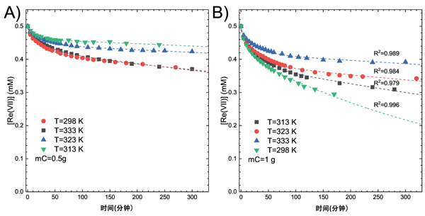 圖2顯示了溶液Re(VII)的初始濃度=0.5mM在不同溫度和活性炭量下的動(dòng)力學(xué)曲線。圖2A和B顯示了當(dāng)每200cm3溶液分別使用0.5和1g活性炭時(shí)的濃度變化。溶液中使用的活性炭量越大,Re(VII)濃度的降低越顯著。這種趨勢歸因于吸附劑的大比表面積,這導(dǎo)致了大容量。碳含量加倍使表面積加倍。