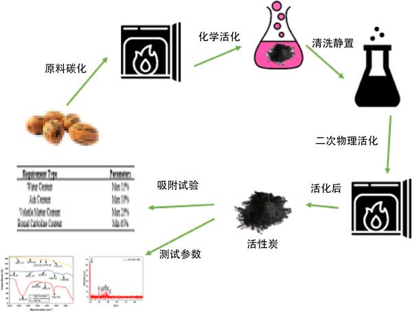 果殼用作生產(chǎn)活性炭的原料。在果殼廢料的合成過(guò)程中,第一步是將殼在陽(yáng)光下干燥3小時(shí)。然后將干燥的果殼在350℃的溫度下碳化2小時(shí)。隨后使用研缽將碳化的果殼研磨成粉末,然后過(guò)100目篩。樣品制備首先稱量肉豆蔻殼粉末和預(yù)定的1M-HCl溶液。接下來(lái),用1M-HCl溶液將粉末活化24小時(shí);罨,活性炭過(guò)濾并用蒸餾水洗滌,直至pH值變?yōu)橹行。一旦pH值為中性,活性炭就會(huì)在110℃的溫度下煅燒1小時(shí)。煅燒后,來(lái)自肉豆蔻殼的碳在惰性氣體氣氛(氮?dú)?中在600℃、650℃和700℃的溫度下退火2小時(shí)。然后用蒸餾水洗滌所得結(jié)果以除去金屬化合物。氨(NH3)水平降低最多的樣品將根據(jù)下面的圖1進(jìn)行表征。