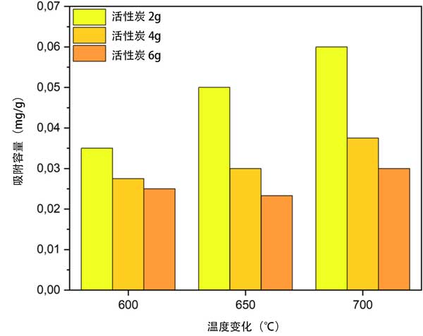從測(cè)試結(jié)果可以看出,在700℃溫度下,吸附劑質(zhì)量為6g,濃度為0.2mg/L,降低百分比為90%。氨(NH3)濃度的降低與質(zhì)量變化的增加和活化溫度的升高成正比。吸附劑質(zhì)量越大且溫度越高,氨(NH3)濃度降低得越多。在圖2中,顯示了活性炭的吸附容量值。因此,可以得出結(jié)論,吸附劑質(zhì)量為2g、溫度為700℃時(shí)達(dá)到最高吸附容量,即0.06 mg/g。然而,盡管700℃下6g吸附劑質(zhì)量顯示出氨(NH3)濃度百分比降低,但與700℃下2g吸附劑質(zhì)量相比,其吸附容量仍然較低,為0.03mg/g。這是由于NH3吸附過(guò)程是由分子間相互作用驅(qū)動(dòng)的,例如靜電引力、氫鍵、范德華相互作用等。此外,結(jié)果表明,源自肉豆蔻殼的活性炭可以有效降低氨(NH3)水平。那么活性炭具有良好的穩(wěn)定性,并通過(guò)吸附容量值證明。