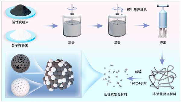 活性炭之所以特別適合用于吸附過程,是因為它具有高度多孔的無定形結構,能夠吸附各種分子。它具有微孔和中孔,可以容納各種大小的分子,補充了分子篩的孔隙特異性。活性炭還具有利用功能基團改變其表面化學性質的潛力,從而增強其與目標分子的相互作用。本文以羧甲基纖維素為黏合劑,通過機械混合和擠出法制備了一系列 華活性炭分子篩復合材料(圖1)。