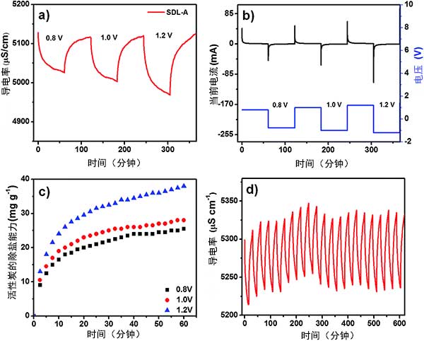 在充電步驟期間,在兩個電極上向膜電容去離子施加正電勢,以從已知NaCl濃度的溶液中吸附離子,并施加負電位以使電極放電并排出廢物流中的離子。圖4a顯示了在NaCl溶液中0.8V至1.2V的各種電位下,活性炭在初始濃度2500mg L-1下的脫鹽性能。在所有施加的電位中,在充電期間首先觀察到溶液電導(dǎo)率的急劇下降,并且當吸附接近平衡時,電導(dǎo)率的變化減小直至達到平臺。圖4b示出了具有增加電勢的正相關(guān)電流瞬變,而圖4c顯示了活性炭電極在不同施加電位下的鹽吸附容量。從0.8V到1.2V,鹽吸附容量從23增加到38mg g-1,表明更高的電池電位可以提高電吸附能力。觀察到的現(xiàn)象可歸因于強靜電力的存在以及在增加的電壓下形成較厚的雙電層。圖4d示出了活性炭電極的循環(huán)穩(wěn)定性,在2500mg L-1的NaCl溶液超過20次充放電循環(huán)而沒有去除能力任何明顯的損失。該結(jié)果證實了使用活性炭當電極可以再生和重復(fù)使用而沒有任何損耗,活性炭是成為用于膜電容去離子應(yīng)用的電極材料的好材料。