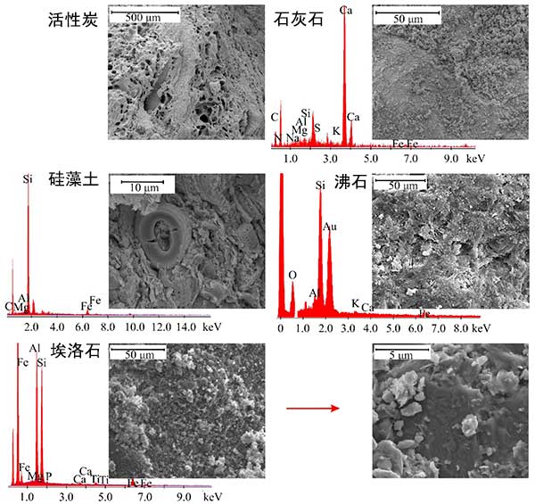 掃描電子顯微鏡(SEM)圖像和反應(yīng)材料的化學(xué)微范圍分析(EDS)如圖2所示。值得注意的是,活性炭樣品具有大膨脹的多孔表面,內(nèi)部孔隙的尺寸達(dá)到十幾微米到幾百微米。石灰石砂的SEM分析證實了這種材料的碳酸鹽特征,而鈣和氧的微區(qū)化學(xué)分析指向方解石(CaCO 3))。SEM-EDS分析表明硅藻土樣品中存在來自二氧化硅基團(tuán)的礦物,并允許將該材料的巖相分類為硅藻土。SEM微圖像證實了中等發(fā)展的沸石和埃洛石的表面,并且在后一種材料的情況下,存在特征性的納米管,然而,在該放大率下不是非常明顯。此外,EDS光譜指出沸石樣品中存在:硅(Si),氧(O),鋁(Al),鉀(K),鈣(Ca)和鐵(Fe),以及:鐵(Fe) ,埃洛石樣品中的鋁(Al),硅(Si),鎂(Mg),磷(P),鈣(Ca)和鈦(Ti)。