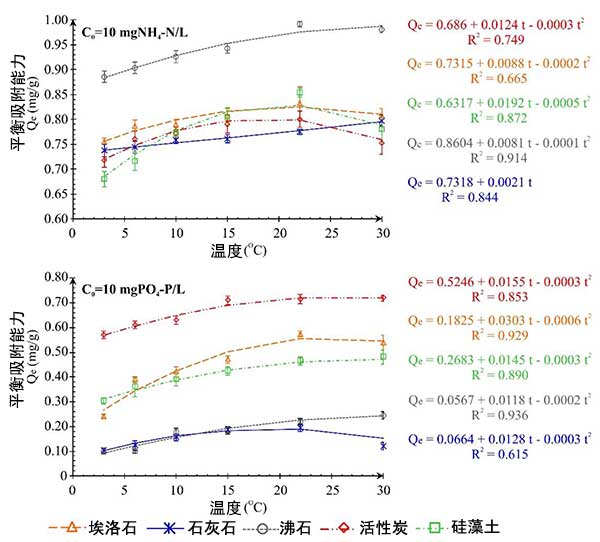 銨和磷酸根離子的平衡試驗僅在3℃至22℃的溫度范圍內(nèi)進(jìn)行,因此,吸附容量和溫度的關(guān)系沒有用多項式函數(shù)描述。類似地,如在系列I的分析中,活性炭對除去銨離子效果比較好,在磷酸鹽的情況下,具有高去除能力的材料是活性炭。