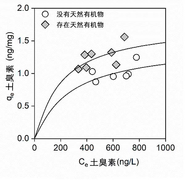 吸附平衡實驗進行60分鐘,這足以根據(jù)動力學(xué)研究達到吸附平衡。圖3顯示了在不存在和存在天然有機物質(zhì)的情況下土臭素在活性炭上的吸附等溫線。如圖2所示,在天然有機物質(zhì)存在下,吸附的土臭素的總量增加。這些結(jié)果意味著天然有機物質(zhì)可以增加活性炭的吸附位點。帶負電荷的天然有機物質(zhì)增加,因為電排斥力,從而增加了活性炭吸附能力。