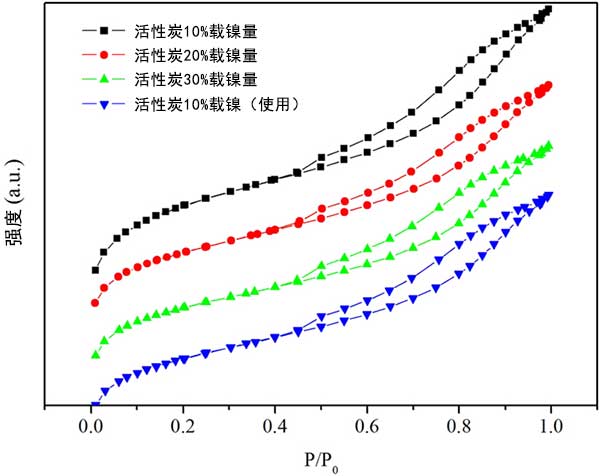 為了研究活性炭載鎳催化劑的可重復(fù)使用性,首先在真空下過濾分離先前實驗的廢活性炭,然后用丙酮徹底洗滌,接著用水洗滌多次。然后將過濾的活性炭在強制通風(fēng)烘箱中在110℃下干燥,然后在管式爐中在氮氣流下在500℃下煅燒4小時。經(jīng)過從新活化的活性炭的測試,活性炭對硬脂酸的產(chǎn)率和選擇性轉(zhuǎn)化為十七烷在重復(fù)三次催化后性能幾乎沒有下降。選擇性保持在約90%,在無溶劑體系中保持穩(wěn)定;钚蕴康腘2吸附-脫附等溫線如圖3所示,表明隨著鎳負(fù)載量的增加,活性炭的表面積和孔體積減小,表明過量的鎳顆粒可能阻塞一定量的活性炭孔并減少孔體積。