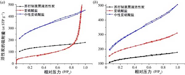 圖1顯示了活性炭在-196℃的氮氣吸附等溫線和孔徑分布及其紋理特征。從看到的圖1中,活性炭的吸附等溫線在很大程度上受到制漿工藝的類型的影響。但是使用蘇打制漿黑液作為前體從活性炭獲得的等溫線遵循I型吸附等溫線;钚蕴康牡赵诜浅5偷南鄬毫ο侣晕⒃黾,隨后在平臺形式中略微吸附增加,相對壓力增加至1,表明存在微孔性。但是,來自亞硫酸鹽的中性亞硫酸鹽制漿的活性炭的等溫線提供了I型和II型的吸附等溫線,這反映在碳結構中存在一些中孔。