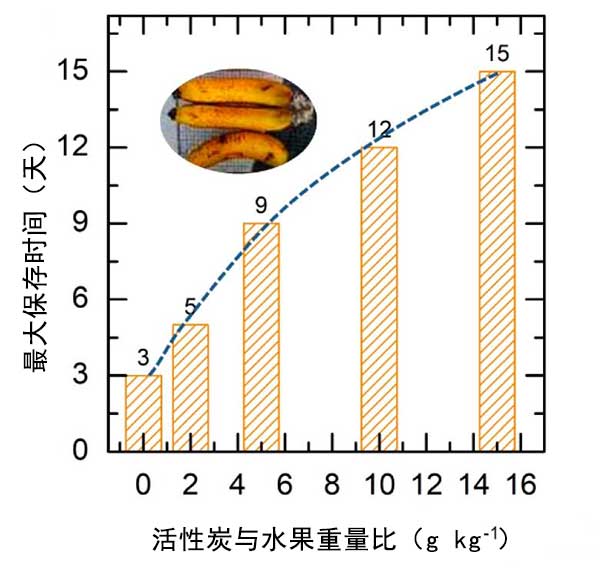 為了研究活性炭用量的影響,改變了活性炭和水果的質(zhì)量比。圖4顯示了活性炭與水果的保存時(shí)間與質(zhì)量比的范圍為;钚蕴康牧繒(huì)影響保質(zhì)期,并且可以看到非線性相關(guān)性(見圖4中的虛線)。沒(méi)有活性炭達(dá)到存在,水果儲(chǔ)存時(shí)間僅為3天。根據(jù)添加的活性炭的質(zhì)量,保質(zhì)期可以從2天延長(zhǎng)至12天。通過(guò)添加15克吸附劑用于1千克水果,可以實(shí)現(xiàn)延長(zhǎng)高達(dá)5倍的保質(zhì)期。較高質(zhì)量的活性炭提供較長(zhǎng)的保存時(shí)間,這可能是由乙烯吸附的活性位點(diǎn)含量較高引起的。結(jié)果表明,氧化鈷浸漬的活性炭有望用于延長(zhǎng)水果的保質(zhì)期。