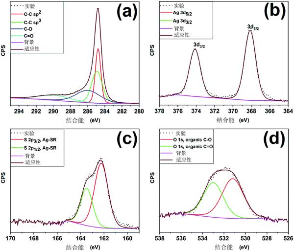 圖2顯示了所制備的活性炭樣品的組成元素的XPS光譜。XPS測量圖顯示碳,銀,硫和氧作為構(gòu)成元素的存在。S 1p光譜配有多個高斯分量,這些物種通常存在于活性炭表面上。圖2(b)分別顯示了多個峰,它們與零價(jià)態(tài)的銀原子一致。S 2p光譜的高分辨率光譜的反卷積,如圖2(c)所示,顯示兩個自旋軌道分裂為〜1.2 eV的峰。O 1s光譜顯示出不對稱的曲線,表明活性炭表面存在多種氧物質(zhì)(圖2d)。光譜的反卷積產(chǎn)生兩個,其可分別歸因于活性炭表面的C-O和C O物質(zhì),因此不存在金屬氧化物物質(zhì)?傊琗PS結(jié)果表明硫醇鹽配體保持附著在銀簇表面的表面上,并且在活性炭樣品中不發(fā)生銀原子的氧化。