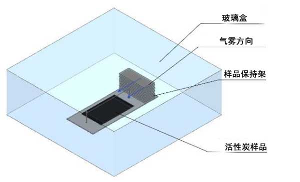 活性炭關于電場附增強吸附測試設備,由一個樣品架組成,樣品架放置在一個33厘米×33厘米×12厘米的帶有硼硅酸鹽玻璃壁的盒子內(nèi)(圖3)。風扇(位于偏轉(zhuǎn)板后面)引起平行的空氣通量到樣品。在細的(直徑為180 µm)鎢絲電極(放電電極)上施加正電勢,而相對電極(活性炭)通過兩端的兩個接地連接接地。