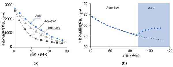圖4:(a)在不存在和存在電場的情況下,甲基乙基酮的濃度。(b)在先打開然后關閉電場的測試中,甲基乙基酮濃度。