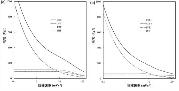 圖4:掃描速率對(a)以活性炭和其他標(biāo)準(zhǔn)條件以及(b)活性炭對總電容的貢獻的影響。C D表示由于擴散引起的電容,而C DL1和C DL2分別表示與納米和微孔表面積以及外部碳表面積相關(guān)的雙層。