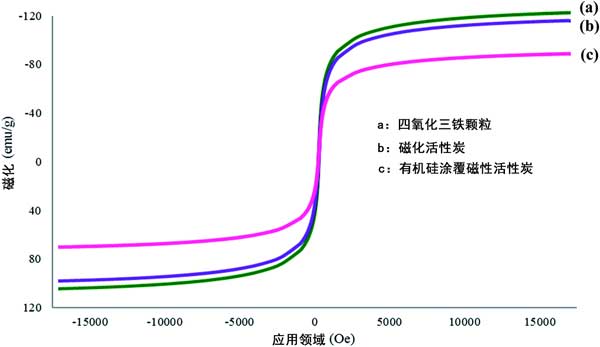 在這項研究中使用VSM來檢查合成活性炭的磁強度。對Fe 3 O 4顆粒,磁性活性炭和機硅涂覆磁性活性炭進行了研究,以研究它們在涂覆時的磁強度趨勢。幾種材料的磁滯回線分別示于圖1(a)-(c)。根據(jù)獲得的結果。由于存在非磁性活性炭和有機硅表面活性劑涂層,磁強度似乎下降了。這確認涂覆過程成功。但是,盡管在涂覆最終材料機硅涂覆磁性活性炭時磁化強度降低,但其磁強度仍在可接受的范圍內,并且強度足以在吸附過程中進行。