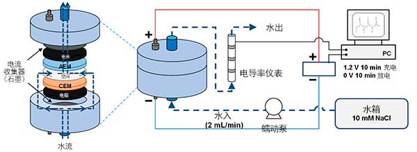 方案1中描述了用于檢查脫鹽性能的膜電容去離子系統(tǒng)。每個(gè)電極由作為集電器的石墨,交流電極和IEM組成。將陰離子交換膜和陽離子交換膜分別放在陽極和陰極上。一對電極由厚度為110 µm的尼龍墊片隔開。使用蠕動泵將進(jìn)料水供應(yīng)到電解池。處理后的溶液直接流過電導(dǎo)率儀,隨后使用單程模式。除了IEM的存在外,還以與電容去離子中使用的相同配置進(jìn)行了CDI實(shí)驗(yàn)。使用電池循環(huán)器在1點(diǎn)分別施加電壓10分鐘。在充電步驟中為2 V,在放電步驟中為0V。從第三個(gè)循環(huán)獲得數(shù)據(jù),并從至少三個(gè)操作中計(jì)算出平均值,以實(shí)現(xiàn)可重復(fù)性。
