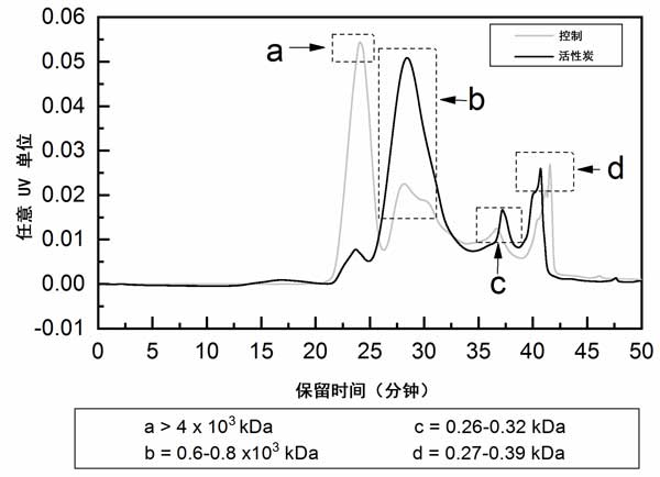 為了檢驗(yàn)活性炭改變可溶性微生物組成,使其對(duì)膜具有更高的親和力這一假設(shè),通過GPC分析了構(gòu)成可溶性微生物的有機(jī)分子的大小分布(圖1)。在第二次可溶性微生物運(yùn)行結(jié)束時(shí)收集了可溶性微生物樣品(圖1b),有趣的是,GPC色譜圖顯示了對(duì)照反應(yīng)堆和活性炭加入反應(yīng)堆之間的明顯差異。在活性炭反應(yīng)器的可溶性微生物中,保留時(shí)間為24分鐘時(shí),來自對(duì)照反應(yīng)器的可溶性微生物的第一個(gè)峰顯著降低,而在活性炭反應(yīng)器的可溶性微生物中,在28分鐘時(shí)觀察到峰的上升(圖1,分別是峰值a和b)。活性炭反應(yīng)器的可溶性微生物中的37分鐘處的峰也升高(峰c)。可溶性微生物中某些有機(jī)化合物含量的變化(升高或降低)可能歸因于,由于微生物群落組成的變化或某些活性炭所觀察到的代謝活性增強(qiáng),導(dǎo)致某些微生物產(chǎn)品的產(chǎn)生和分泌增加另外,或抑制進(jìn)水橄欖油廢水中物質(zhì)的降解。有機(jī)化合物對(duì)活性炭顆粒的吸附只會(huì)降低其在可溶性微生物中的外觀。由于吸附到活性炭上,可溶性微生物中某些成分的減少(如峰a所示)也有可能優(yōu)先吸附其他成分,這些成分對(duì)通量的減少更不利,或者起膜調(diào)節(jié)前體的作用,這可能會(huì)增強(qiáng)生物膜的生長(例如峰b–d)。顯然,確定膜上有機(jī)污染物的身份是一項(xiàng)必不可少的任務(wù),目前,尚不清楚不同可溶性微生物組分對(duì)膜污染的詳細(xì)影響以及它們被活性炭的吸附。