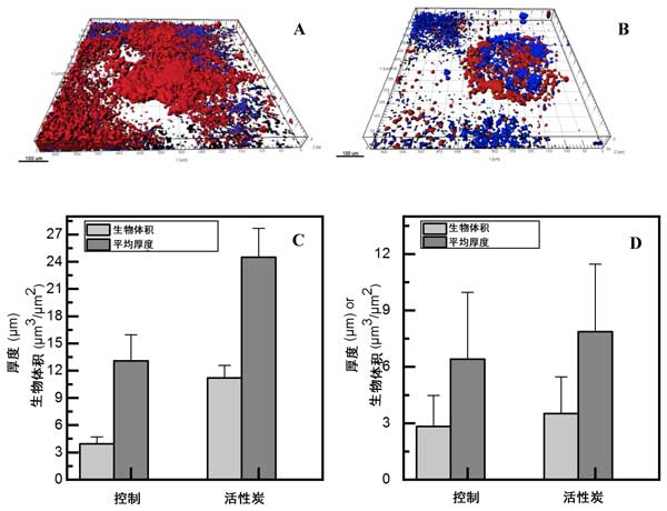 為了分析由于在膜生物反應(yīng)器中添加活性炭而導(dǎo)致生物膜形成增加的可能性,并進(jìn)一步闡明活性炭反應(yīng)器中膜性能下降幅度更大的原因,在第一個(gè)處理結(jié)束時(shí)進(jìn)行了檢測(圖2A,B)。在比較兩個(gè)反應(yīng)器之間生物膜結(jié)構(gòu)的性質(zhì)時(shí),可以觀察到活性炭反應(yīng)器通量下降的增加顯然與生物膜生長的幅度有關(guān)。在第一次膜生物反應(yīng)器運(yùn)行結(jié)束時(shí)從模塊上獲取的兩塊膜上生物膜的CLSM分析顯示,活性炭和對(duì)照反應(yīng)器之間細(xì)胞的生物體積及其自相關(guān)EPS的差異很大(圖2)。當(dāng)補(bǔ)充活性炭時(shí),生物膜生長的升高支持了膜滲透性的更高降低,這是由可溶性微生物組分吸附的升高引起的,這可能會(huì)更好地調(diào)節(jié)膜表面,從而增強(qiáng)生物膜的形成。