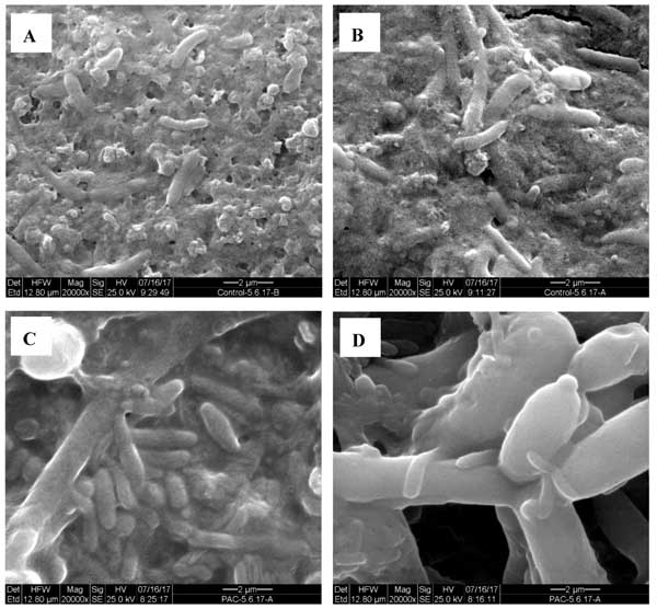 由于添加了活性炭的膜生物反應(yīng)器膜滲透性的更大降低可能歸因于活性炭顆粒,因此在第一個(gè)實(shí)驗(yàn)結(jié)束時(shí)對(duì)結(jié)垢的膜進(jìn)行SEM成像(圖3)。沒有觀察到來自活性炭和對(duì)照的生物膜形態(tài)的主要差異,并且在兩種情況下,均檢測到EPS基質(zhì)中的包埋細(xì)胞。值得注意的是,從填充了活性炭的反應(yīng)器收集的任何樣品中都未發(fā)現(xiàn)活性炭顆粒(圖3c,d)。因此,在活性炭反應(yīng)器中跨膜壓力的升高和膜滲透性的更高降低不能歸因于活性炭顆粒對(duì)膜的物理阻塞。