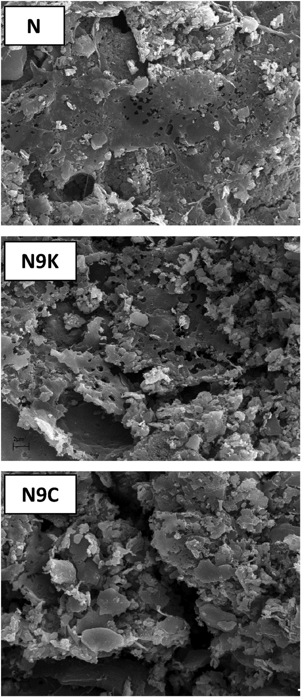 活性炭和經(jīng)改性后獲得的樣品的化學(xué)成分。兩種修飾均導(dǎo)致灰分含量以及結(jié)構(gòu)中特定元素的變化,其中這些變化對(duì)N9K樣品而言更大。起始活性炭(N)暴露于碳酸鉀會(huì)導(dǎo)致礦物質(zhì)(灰分)的顯著下降,同時(shí)氫含量下降兩倍(可能是碳結(jié)構(gòu)芳構(gòu)化的結(jié)果)由于活性炭顆粒的表面氧化,增加了氧氣量。還值得注意的是,灰分含量比在CO 2中退火的N9C樣品低了近10倍。大氣層。N9K中的灰分很可能是由于活化后將其用5%的鹽酸溶液洗滌而導(dǎo)致的。圖1所示的SEM圖像也證實(shí)了各個(gè)活性炭的質(zhì)地和形態(tài)多樣性?梢钥闯觯鶕(jù)制備程序,樣品在尺寸,形狀以及孔的數(shù)量或排列方面存在顯著差異。特別是在活性炭和N9C樣品中可以觀察到的較亮片段可能是其結(jié)構(gòu)中存在灰分(礦物質(zhì))的結(jié)果。