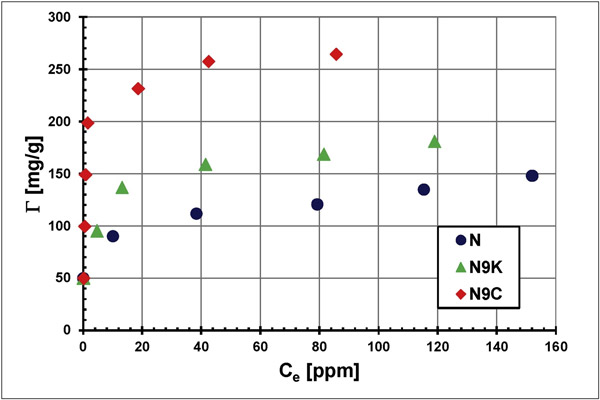 在圖3中比較了初始濃度為100 ppm的活性炭,N9K和N9C表面上初始濃度為100 ppm的聚合物溶液中PAA(Γ)的吸附量。。可以看出,對(duì)于所有檢查的活性炭,觀察到隨著pH升高聚合物吸附明顯減少。這是由于所檢查系統(tǒng)中的靜電條件從有利的吸引條件(在較低的pH值)變?yōu)椴焕呐懦鈼l件(在較高的pH值)而引起的。而且,在更酸性的環(huán)境中,聚合物鏈的盤繞構(gòu)型使得吸附層的堆積更為緊密(高PAA吸附)。在較高的pH值下,PAA鏈發(fā)展的增加導(dǎo)致表面層中吸附的大分子的構(gòu)型更加延長,其特征是聚合物鏈段的堆積密度顯著降低(PAA吸附低)。