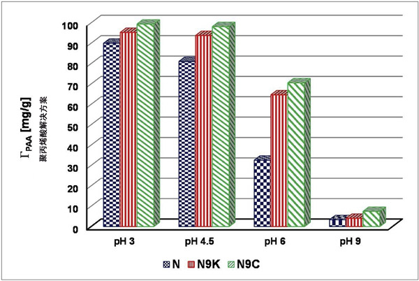 圖3:在pH值分別為3、4.5、6和9的活性炭,N9K和N9C表面上,初始濃度為100 ppm的聚合物溶液中PAA(Γ)的吸附量。