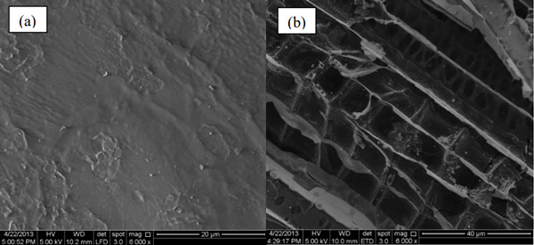 圖1:(a)原材料(x6k)和(b)活性炭(x6k)的SEM顯微照片。